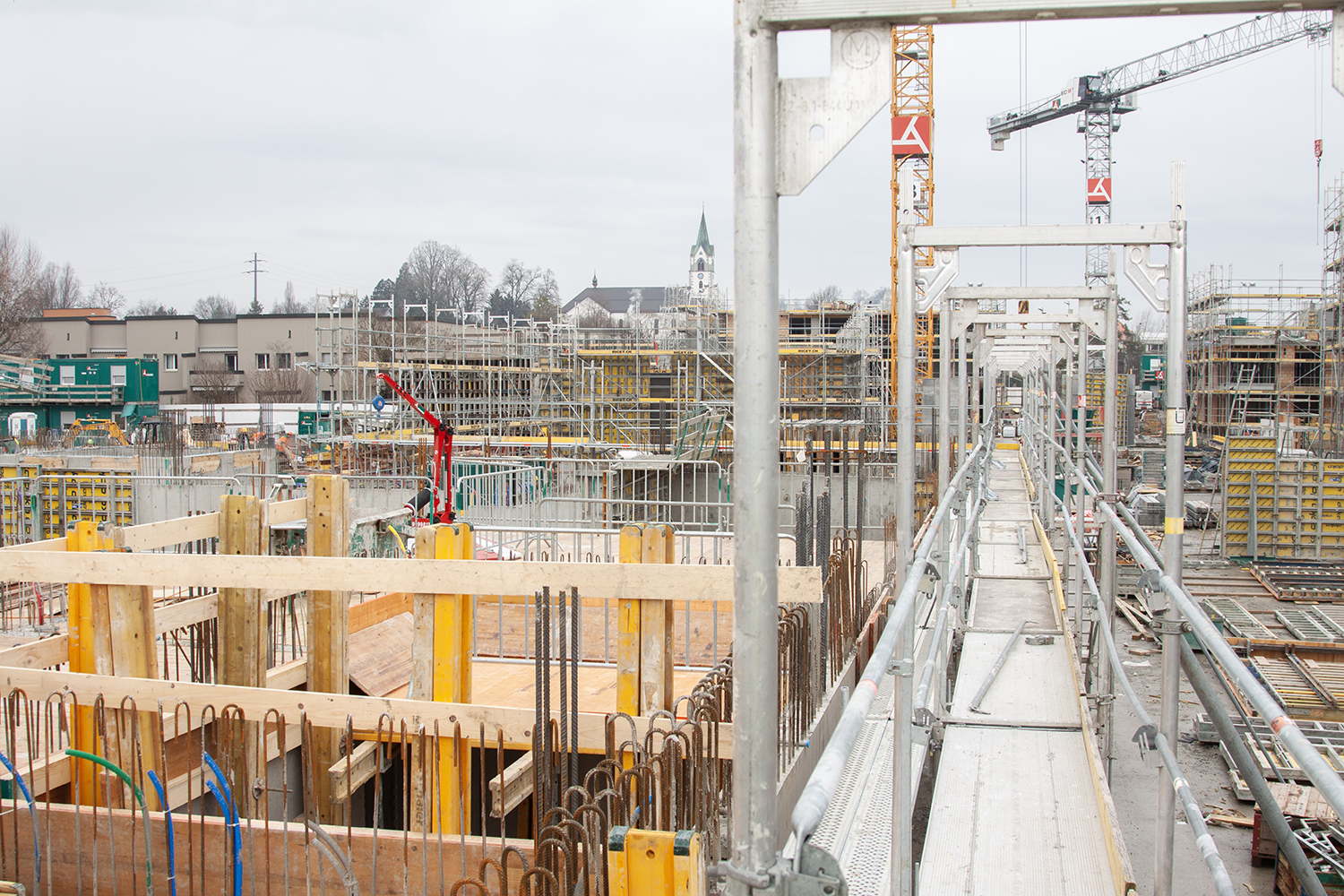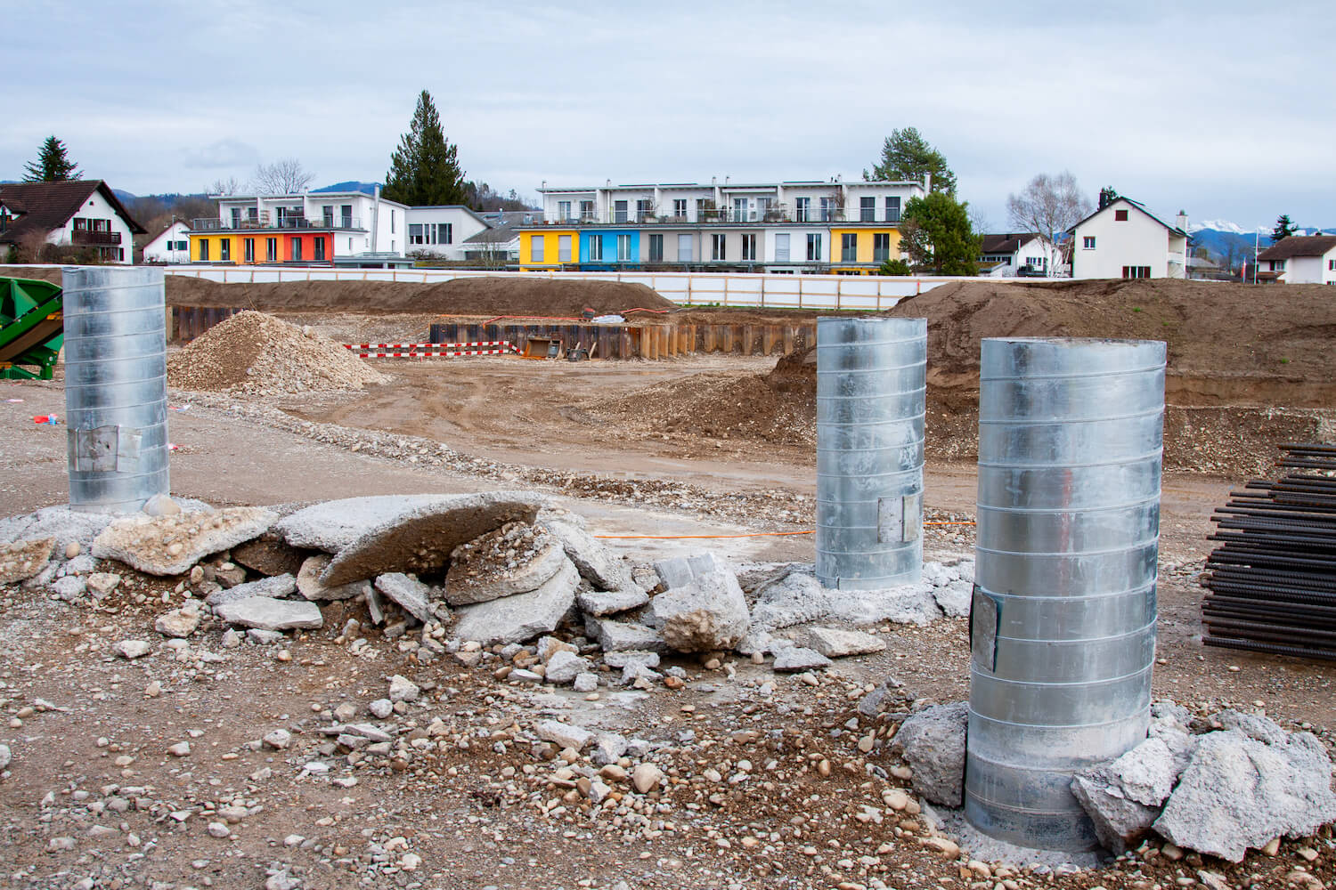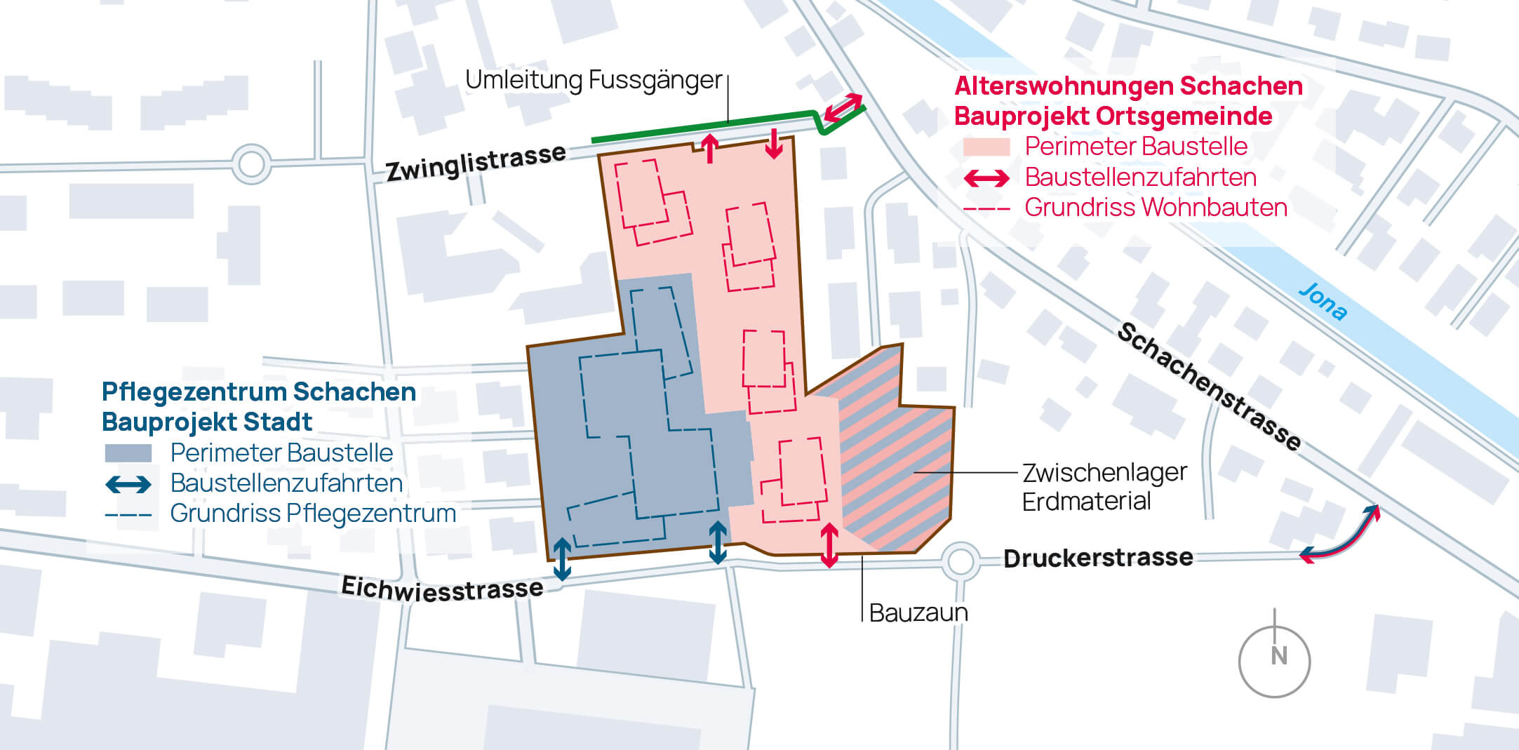 • Die Baustellenzufahrt für die Baustelle der Ortsgemeinde (Alterswohnungen) befindet sich an der Zwinglistrasse sowie an der Druckerstrasse. Im Bereich der Zwinglistrasse wird für Fussgängerinnen und Fussgänger eine gesicherte Umleitung erstellt.