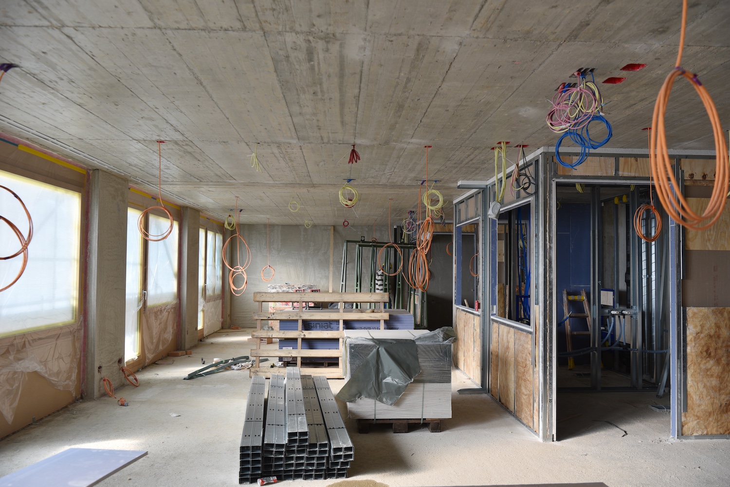 Nach dem Abschluss des Rohbaus im Sommer 2025 laufen die Rohinstallationen der Haustechnik (Sanitär, Heizung, Lüftung und Elektro) auf Hochtouren. Aktuell werden die zentralen Anlagen installiert. In den künftigen Bewohnerzimmern sind Gipserarbeiten sowie der Unterlagsboden mit Dämmung und der Einbau der Fussbodenheizung in Arbeit.